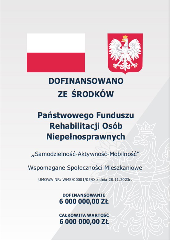 Projekt pt. „Samodzielność-Aktywność-Mobilność” jest w całości dofinansowany przez Państwowy Fundusz Rehabilitacji Osób Niepełnosprawnych (PFRON), w wysokości 6 000 000,00zł, na podstawie umowy nr WMS/000001/05/D.